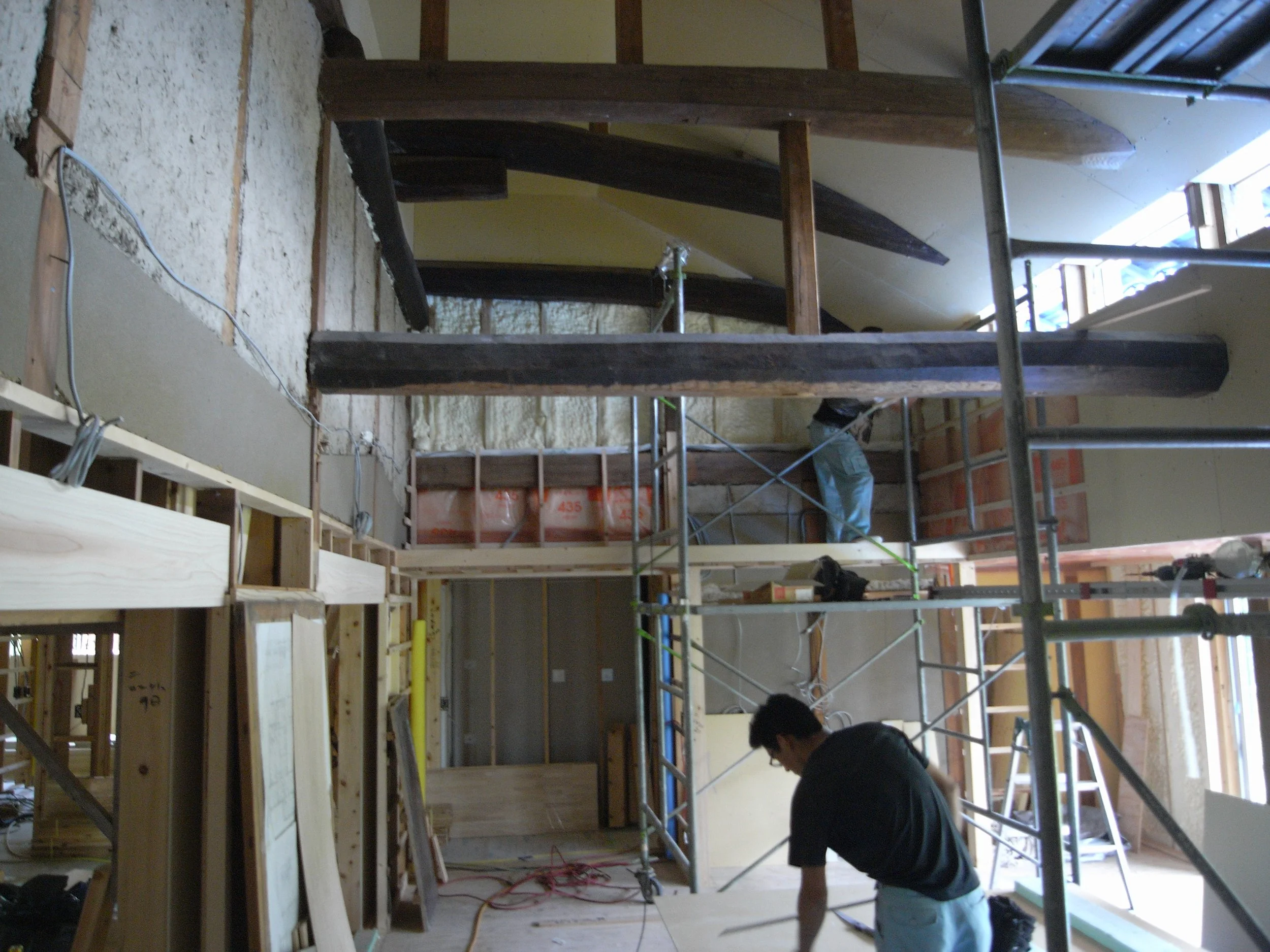 内側に新たに基礎を打ち、土台を敷き、柱梁